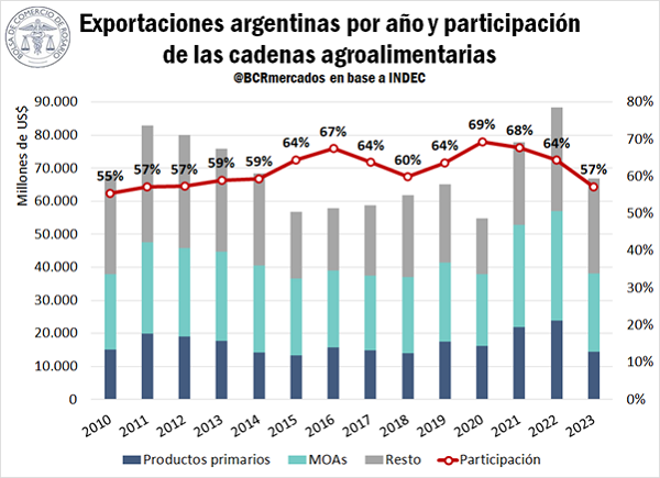 En el 2023, las cadenas agroalimentarias generaron exportaciones por US$ 38.234 millones, retrocediendo un 33% interanual luego del récord alcanzado en 2022. Esto se vio explicado principalmente por la fuerte caída productiva resultante de la sequía, pero también por una disminución en los precios de exportación, que habían crecido fuertemente a principios de 2022 al iniciarse la guerra entre Rusia y Ucrania.