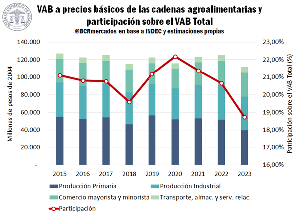 Las cadenas agroalimentarias explicaron el 18,7% del PBI argentino en 2023. El VAB agroalimentario alcanzó en 2023 un estimado de 111.636 millones de pesos de 2004, retrocediendo un -10,8% respecto del valor alcanzado en 2022.