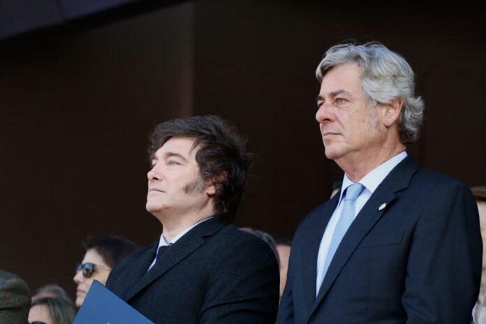 Una persona del equipo de seguridad se lo acercó a Milei hasta la primera fila, y entre carcajadas y chistes, el mandatario le agitó al ministro Caputo el rebenque mientras intercambiaban miradas de complicidad.