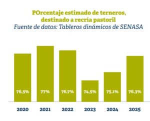 Como punto de partida, al 31 de diciembre de 2024 el stock oficial de terneros y terneras ascendía a 14,6 millones de cabezas. De este total disponible al inicio del ciclo, 10,7 millones, es decir un 73%, fueron trasladados desde los campos de cría durante el año, aproximadamente 500 mil terneros más que en 2024, aunque partiendo prácticamente de la misma disponibilidad inicial.