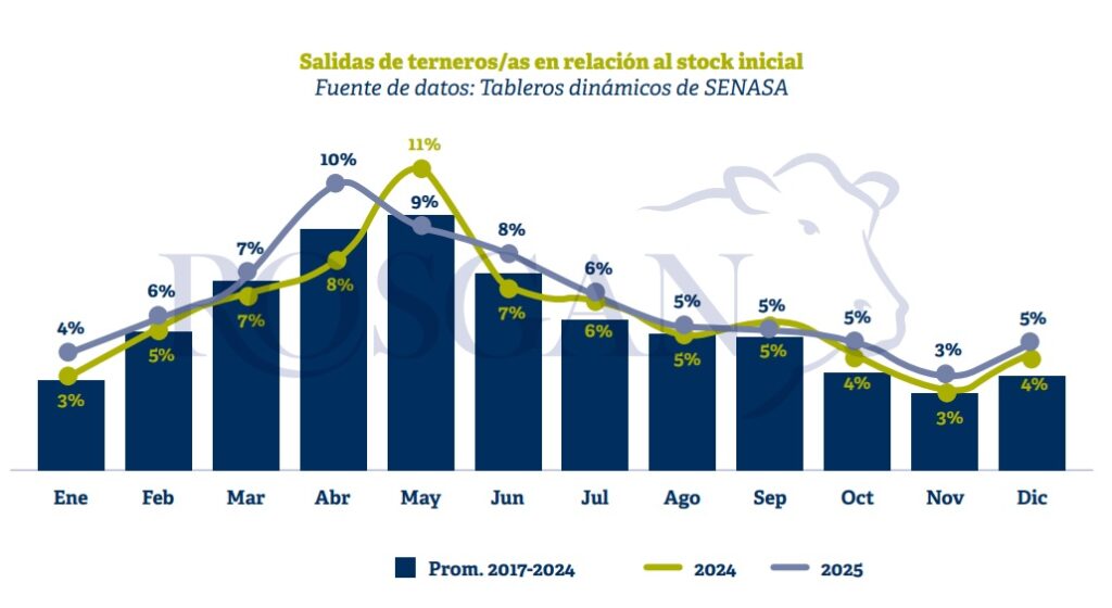 En comparación con años anteriores, 2025 fue el año de mayor movimiento relativo de terneros, superando el 67% que representa el promedio de los últimos ocho años. Asimismo, el mes de mayor salida se registró en abril, aproximadamente un mes antes de lo habitual, lo que estuvo incentivado por la buena condición de la hacienda y por los muy buenos precios que comenzaba a registrar la invernada, aún en plena zafra.