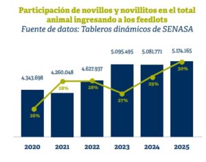 Asimismo, la participación de novillos dentro de la salida total de animales terminados en los feedlots representó en 2025 el 23,5%, comparado con el 21% promedio de los últimos cinco años.