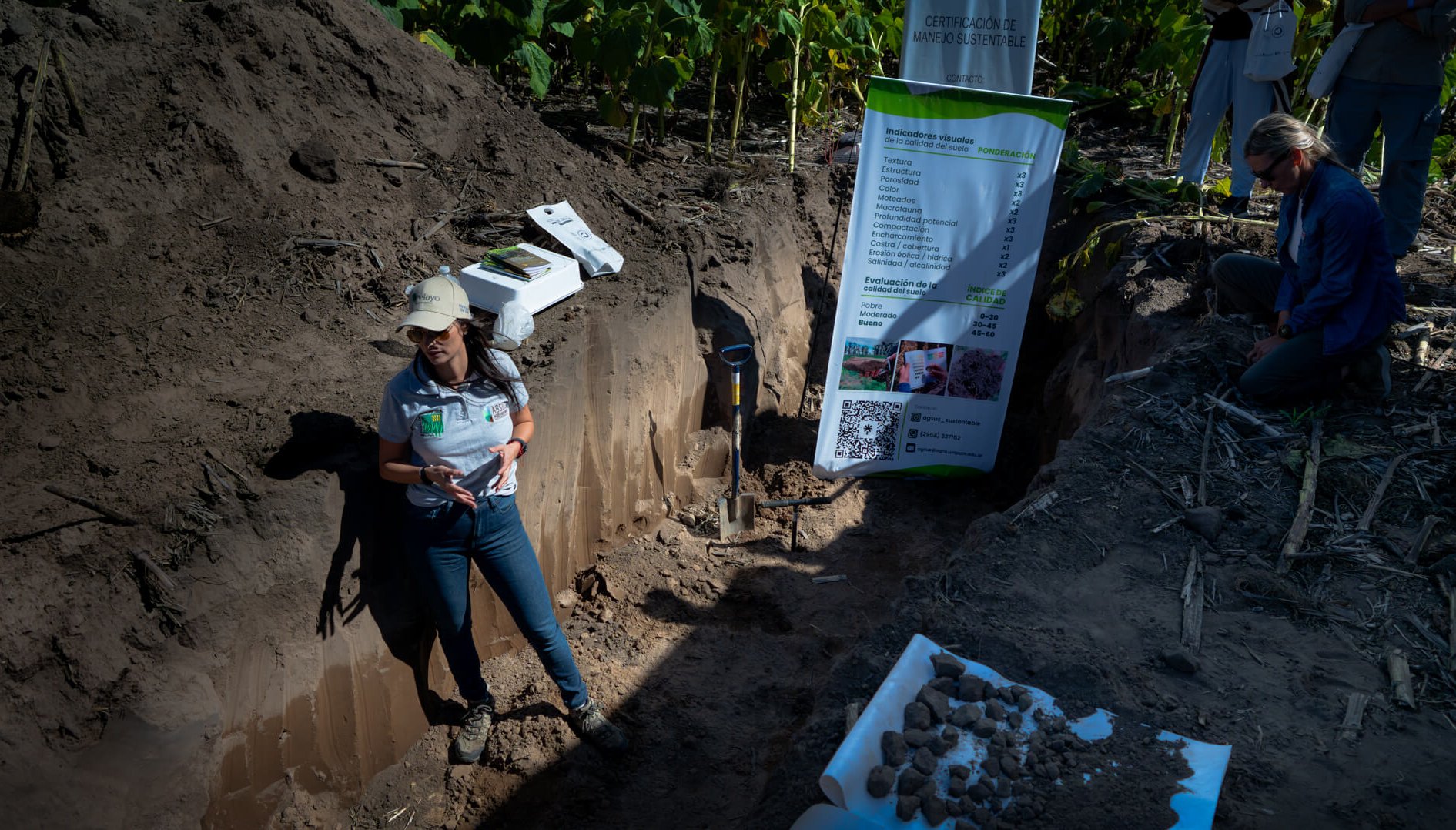 Entre las herramientas aplicadas se cuentan las Evaluaciones Visuales del Suelo (EVS), metodologia validada por la FAO que mide textura, estructura, porosidad, color, presencia de lombrices y macrofauna, profundidad radicular, compactacion, erosion, salinidad y cobertura vegetal, entre otros indicadores. Estos diagnosticos permiten priorizar intervenciones y disenar planes de manejo adaptados a cada lote.