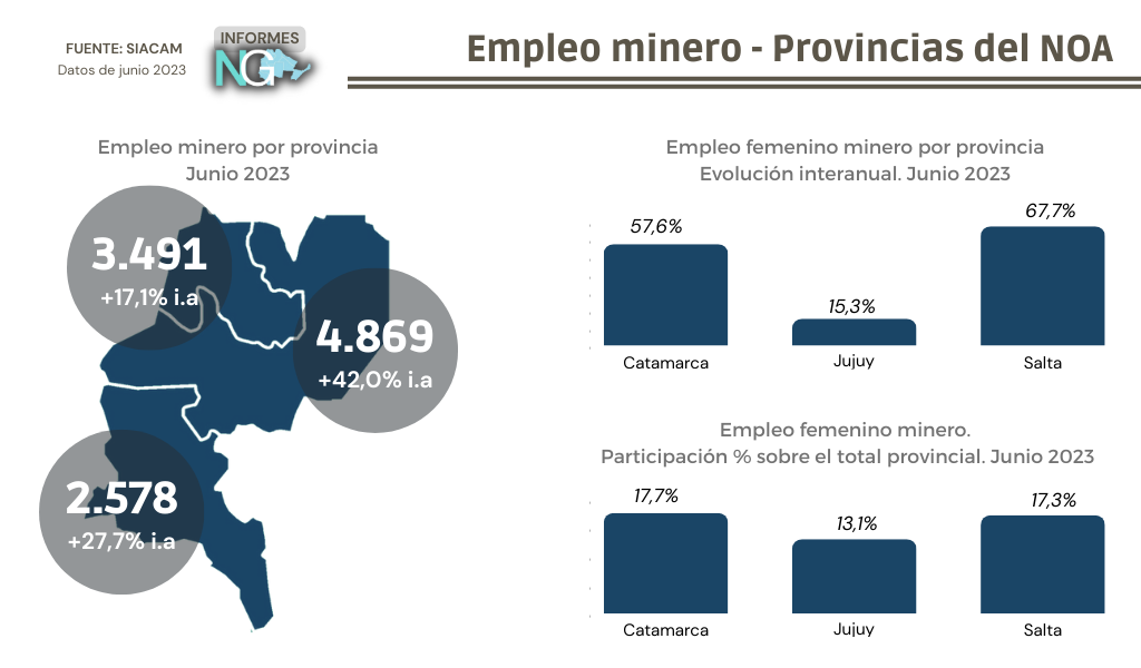 Las provincias del NOA con actividad minera, que son Salta, Jujuy y Catamarca, registraron en total unos 10.938 trabajadores en el sector minero en junio, explica el 28% del total nacional. Entre estas se destaca Salta con 4.896 y le siguen luego Jujuy con 3.491 y Catamarca con 2.578.