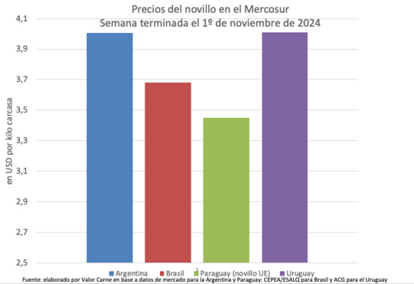 Argentina: el novillo pesado y trazado cotiza a USD4,01, al tipo de cambio neto de la exportación, marcando seis centavos de aumento en la semana. Con un tipo de cambio neto estable, ya que la devaluación en el mercado oficial fue neutralizada por bajas en los mercados financieros, la suba promedio de $50 en los ofrecimientos de las plantas, frente a una oferta de la categoría que no es fluida, generó el citado incremento. Esta semana empata con el precio en Uruguay, siendo ambos líderes en la materia en la zona.