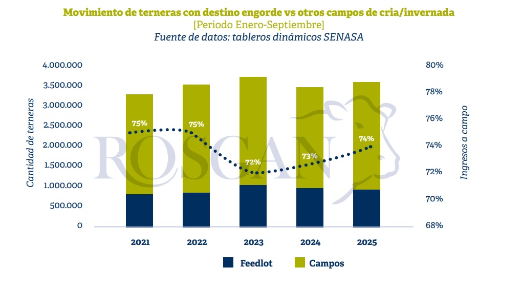 En este sentido, al observar lo sucedido dos años atrás, en 2023, vemos que el porcentaje de terneras que, habiendo salido de los campos de cría, continuó fuera de los corrales de engorde había caído significativamente del 75% al 72%. Curiosamente, esta caída estuvo mucho más asociada al contexto político de ese momento —pleno año electoral— que a factores climáticos, que sí habían sido mucho más críticos en 2022.