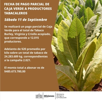 El Ministerio del Agro y la Producción, comunica que se realizará un pago parcial de Caja Verde para el total de Tabaco Burley, Virginia y Criollo acopiado, que corresponde a 12.015 productores. Será un total $485.673.780,00. pesos destinados a los tabacaleros.