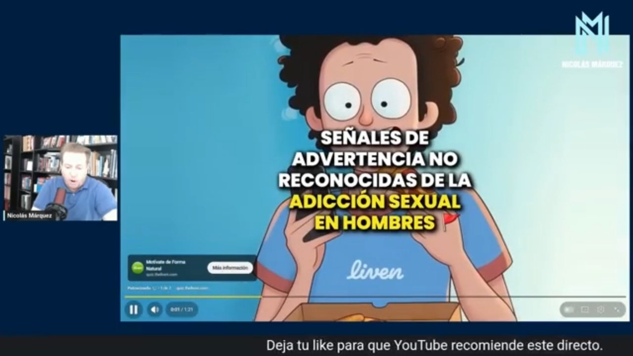 El escritor y biógrafo del presidente Javier Milei, Nicolás Márquez, protagonizó un momento sumamente incómodo durante una de sus transmisiones en vivo por YouTube. Mientras realizaba un streaming para sus seguidores, el algoritmo de la plataforma le jugó una mala pasada y mostró publicidades relacionadas con la adicción sexual y el uso de pornografía, generando un papelón que se viralizó rápidamente en las redes sociales.