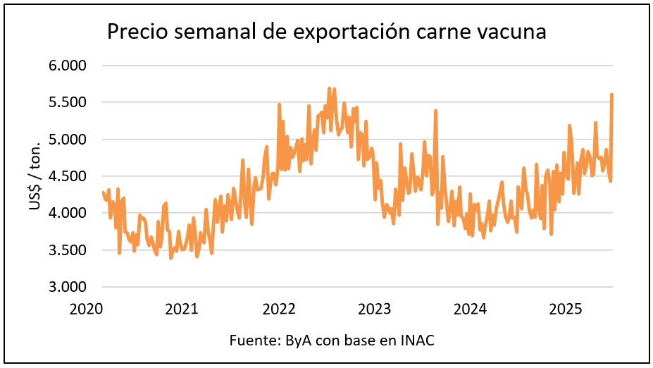 Se situó en US$ 5.608 por tonelada y, si bien es un dato preliminar que posiblemente tenga algún ajuste en los próximos días, llevó el promedio de los últimos 30 días a US$ 4.765, de acuerdo a los datos primarios de INAC, en el rango de precio más alto desde octubre de 2022.