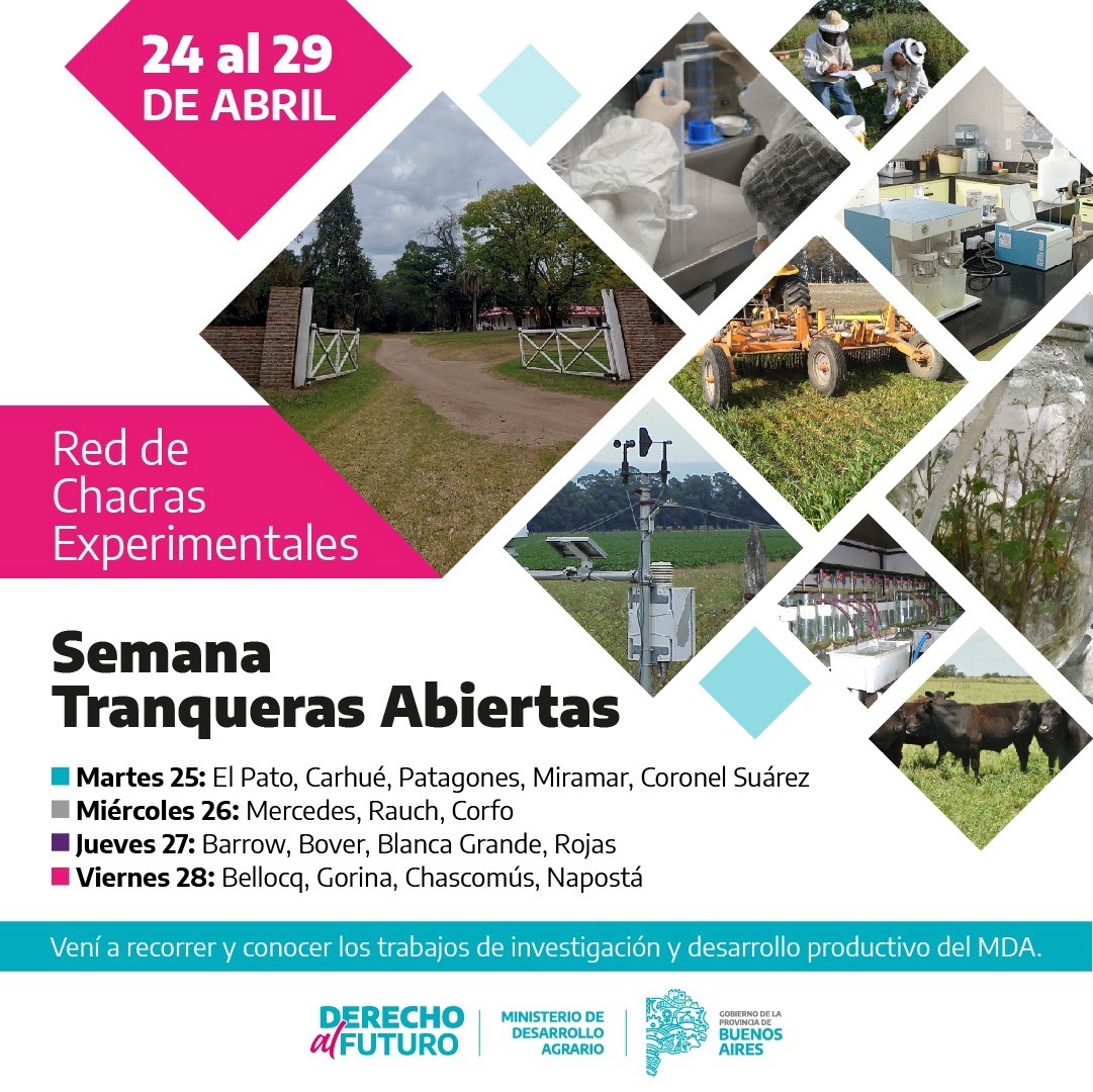 El martes 25 “abrirán sus tranqueras” las Chacras Experimentales de Carhué (Adolfo Alsina), El Pato (Berazategui), Patagones, Miramar (General Alvarado) y Coronel Suárez; el miércoles 26, las Chacras de Mercedes, Rauch y Campo Piloto CORFO (Villarino); el jueves 27, Barrow (Tres Arroyos), Blanca Grande (Olavarría), Rojas y el apiario Pedro J. Bover (General Belgrano); y el viernes 28, Bellocq (Carlos Casares), Gorina (La Plata), Chascomús y Napostá (Bahía Blanca).