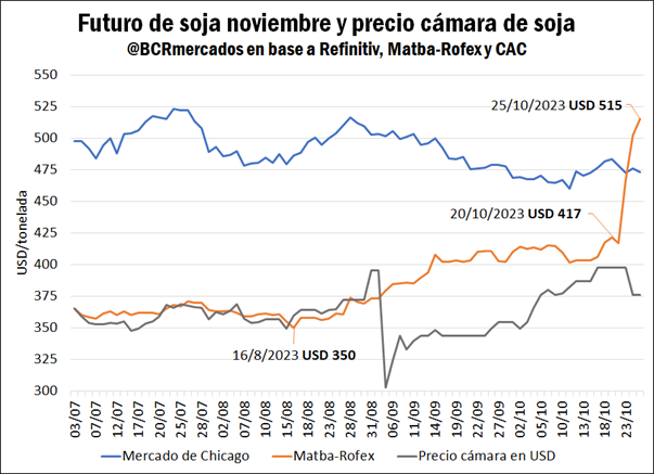 Este nuevo régimen de liquidación de divisas, sumado a la baja disponibilidad de soja por vender, ha mostrado un claro impacto alcista en los precios de los mercados de futuros locales, principalmente en los contratos de soja noviembre. Dado que el reglamento del Matba-Rofex establece que los cobros y pagos de los contratos denominados en dólares se realizan en pesos al tipo de cambio de referencia publicado por la institución; es decir, al tipo de cambio oficial, los operadores del mercado debieron ajustar la cotización de los contratos en dólares para reflejar el nuevo régimen que estará vigente durante gran parte del próximo mes.