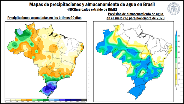 Pero mientras la mayoría de los estados del país experimentaron un déficit de precipitaciones, especialmente en el noreste, en el sur de Brasil se observa un exceso de lluvias debido a la presencia de un año Niño, con los estados de Rio Grande do Sul y Santa Catarina con el mayor volumen de precipitación acumulada. Estos grandes volúmenes de lluvia podrían elevar los niveles de almacenamiento de agua en el suelo por encima del 90%, generando un excedente de agua principalmente en el sur del país.