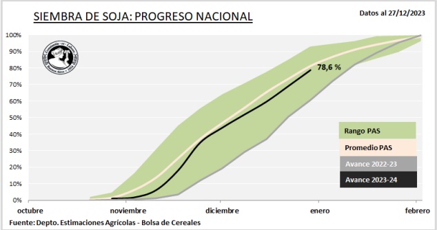 Luego de un progreso intersemanal de 9,5 puntos porcentuales, la siembra de soja cubre el 78,6 % de la superficie proyectada. Resta incorporar el 12,8 % de primera, concentrado principalmente sobre el norte de la región agrícola, donde la falta de piso demora las labores.