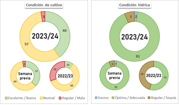 El 97,8 % de los lotes implantados, presenta una condición de cultivo Normal/Excelente, con el 10 % ya iniciando estadios reproductivos bajo óptimas condiciones hídricas.