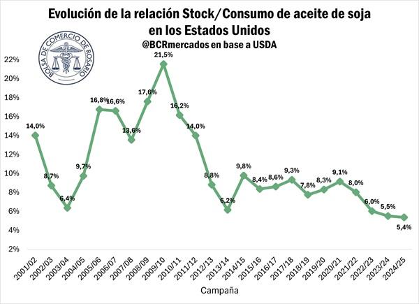 Los datos más interesantes respecto a la oleaginosa estadounidense vinieron por el lado del aceite. La proyección de producción norteamericana se incrementó a partir de una mejor ratio de extracción y se elevaron las exportaciones para la actual campaña de 272.000 a 499.000 toneladas, un 83% de aumento para alcanzar un máximo en tres años, aunque bastante por debajo de la media de la última década (en los últimos años, los incentivos a la producción de biocombustibles aumentaron fuertemente el consumo interno del aceite de soja).