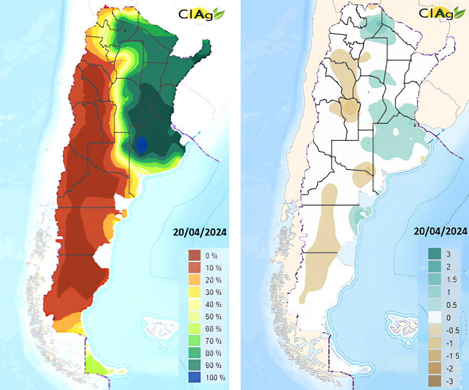 En su informe del 22 de abril, la cátedra de Climatología y Fenología Agrícolas de la Facultad de Agronomía de la UBA (FAUBA) destacó que la humedad en el suelo hasta un metro de profundidad aumentó en toda la región agrícola de secano, favoreciendo la próxima siembra de los cultivos de invierno. Mientras tanto, se estiman pérdidas de casi 7 millones de toneladas en maíz por cuestiones sanitarias. El pronóstico oficial de El Niño-Oscilación del Sur, por su parte, indica una probabilidad del 85% de condiciones neutras hasta el invierno, aumentando luego al 60% para la ocurrencia de un escenario Niña.