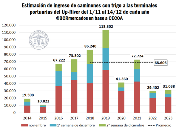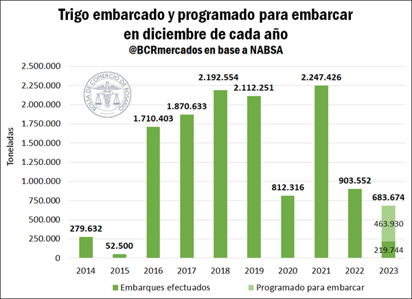 Esta situación en la logística terrestre se replica en el transporte marítimo del cereal. Teniendo en cuenta los buques de trigo despachados entre el 1 y el 14 de diciembre, y lo programado a embarcar en lo que resta del mes, se estima que se despacharán poco más de 683.600 toneladas del cereal, el volumen más bajo observado desde 2015 para el primer mes de la campaña comercial.