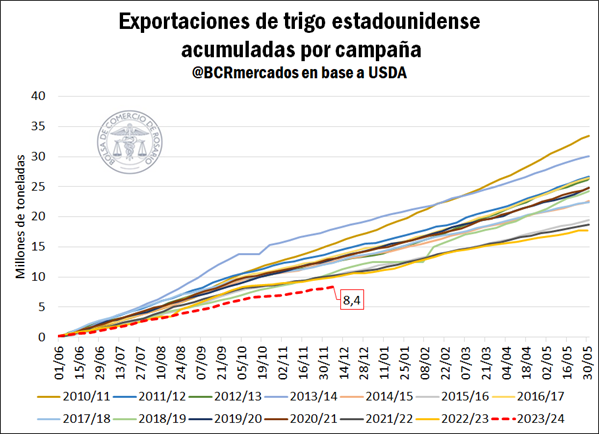 Sin embargo, a pesar del incremento en el trigo estadounidense comprometido a exportarse, las ventas externas del cereal durante el mes de noviembre mantuvieron un ritmo lento, totalizando apenas 1,1 Mt y marcando un volumen mínimo en diez años. Consecuentemente, los datos del USDA de esta semana advierten que al 7 de diciembre las exportaciones acumuladas de trigo estadounidense se ubicaron en apenas 8,4 Mt, el menor nivel para igual período en lo que va del siglo.