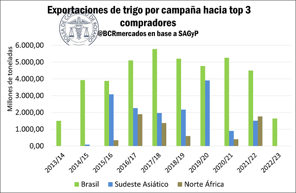 En el siguiente gráfico se muestra la evolución de las exportaciones de trigo por campaña a los principales destinos. Tal como se comentó anteriormente, Brasil se posiciona como el más fuerte, inclusive ha sido donde Argentina ha consolidado sus envíos en la actual campaña 2022/23. Mientras que, las ventas al sudeste asiático alcanzaron el máximo en la 2019/20 con casi 4 Mt.