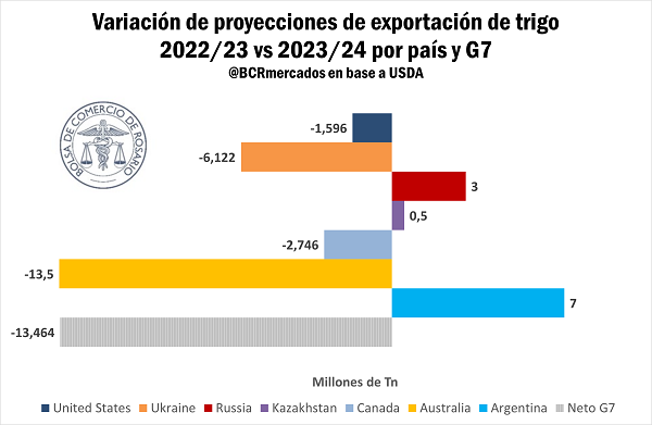 Sin embargo, se esperan recortes productivos en suelo australiano y a nivel global para lo que es la campaña entrante 2023/24. De hecho, para el conjunto de los siete países que más exportan trigo (incluido Argentina), se proyectan mermas de volúmenes exportables por casi un 9%.