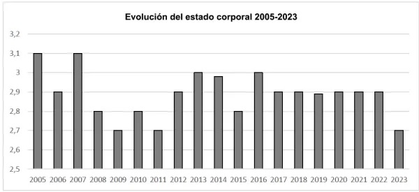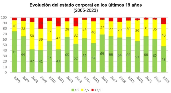 La Estación Experimental realiza este monitoreo desde 2004. De ahí surge que desde 2017 hasta 2022 la condición corporal se mantuvo estable en un valor de 2,9 mientras que este año descendió a 2,7.