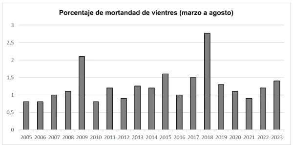 En tanto, el porcentaje de mortandad durante el periodo marzo-agosto de 2023 fue de 1,4% del total de vientres monitoreados; un aumento con respecto al año pasado “posiblemente asociado a la baja condición corporal”, señala el informe.