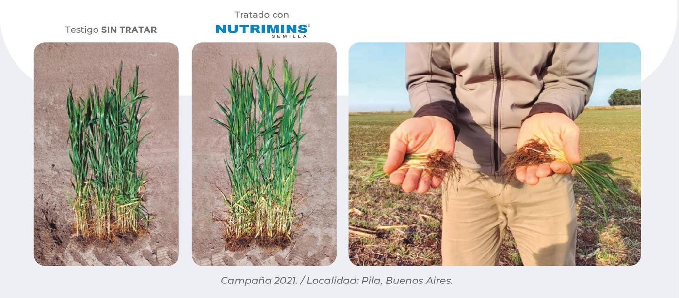 En el caso de la semilla, la herramienta es Nutrimins Semilla, un fertilizante líquido con efecto estimulador de crecimiento. Está formulado con zinc quelatado (7%), azufre (3%) y cofactores de crecimiento hormonales, y la dosis sugerida en marbete es de 0,5 litros cada 100 kilogramos de semilla.